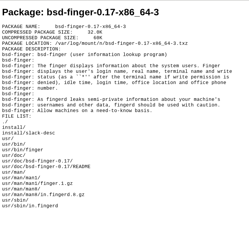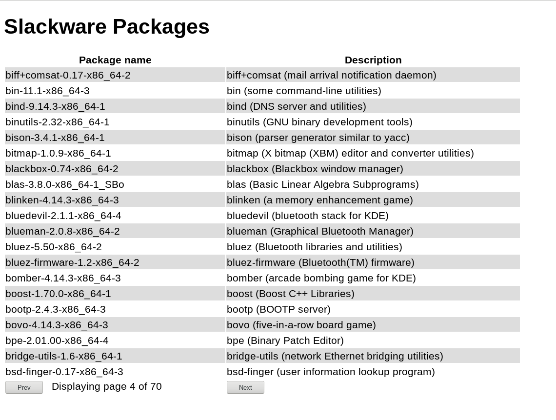 /var/lib/pkgtools/packages/(usescandir()), where the filename is the 'name' field the first line in the file following thePACKAGE DESCRIPTIONline to use as the 'desc' field.